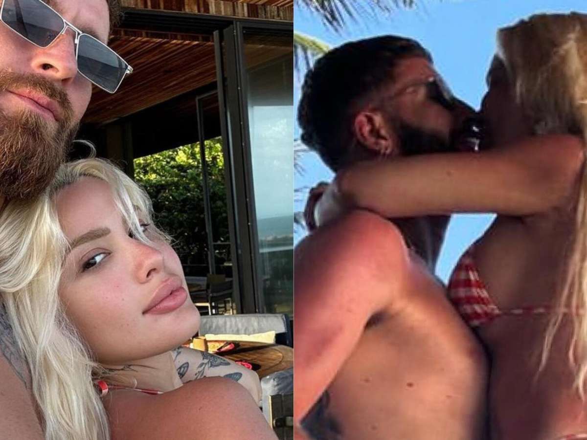 De biquíni fio-dental, Karoline Lima surge em clima quente com jogador Léo Pereira