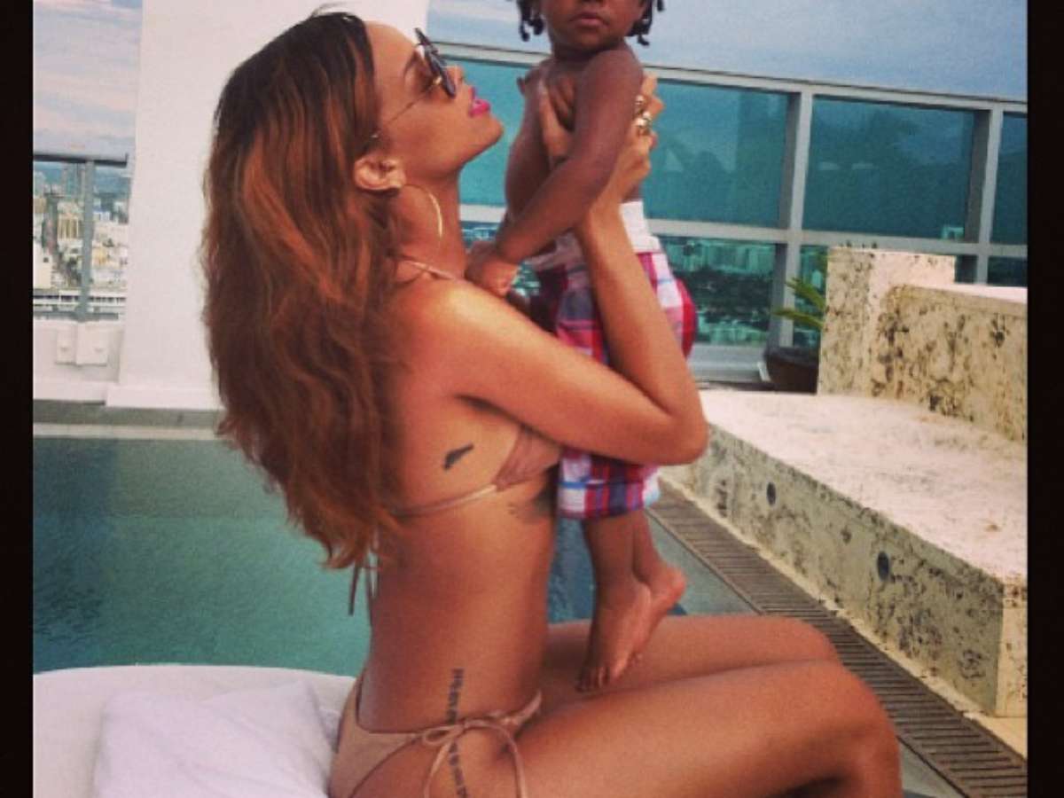 De biquíni, Rihanna posta foto com criança: "faz jogo duro, mas ama"