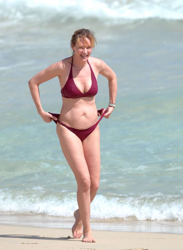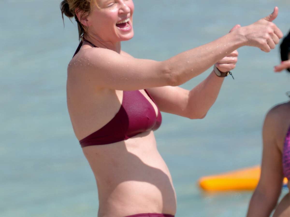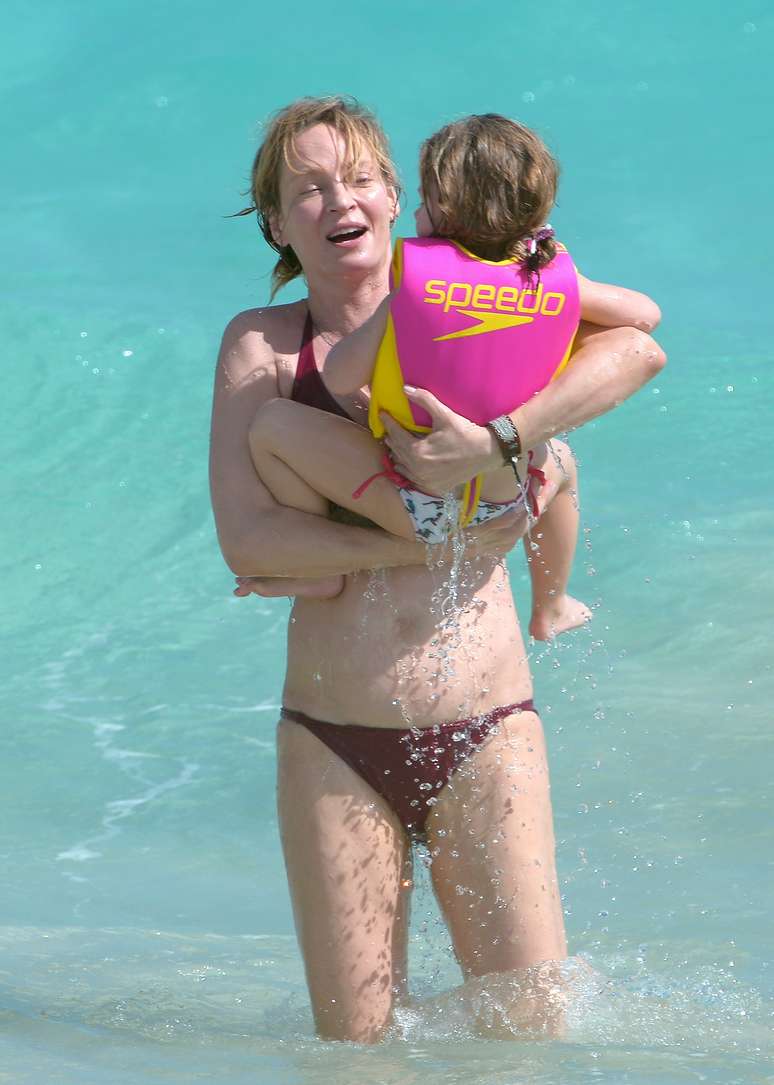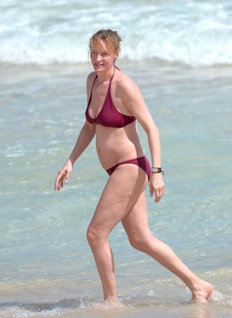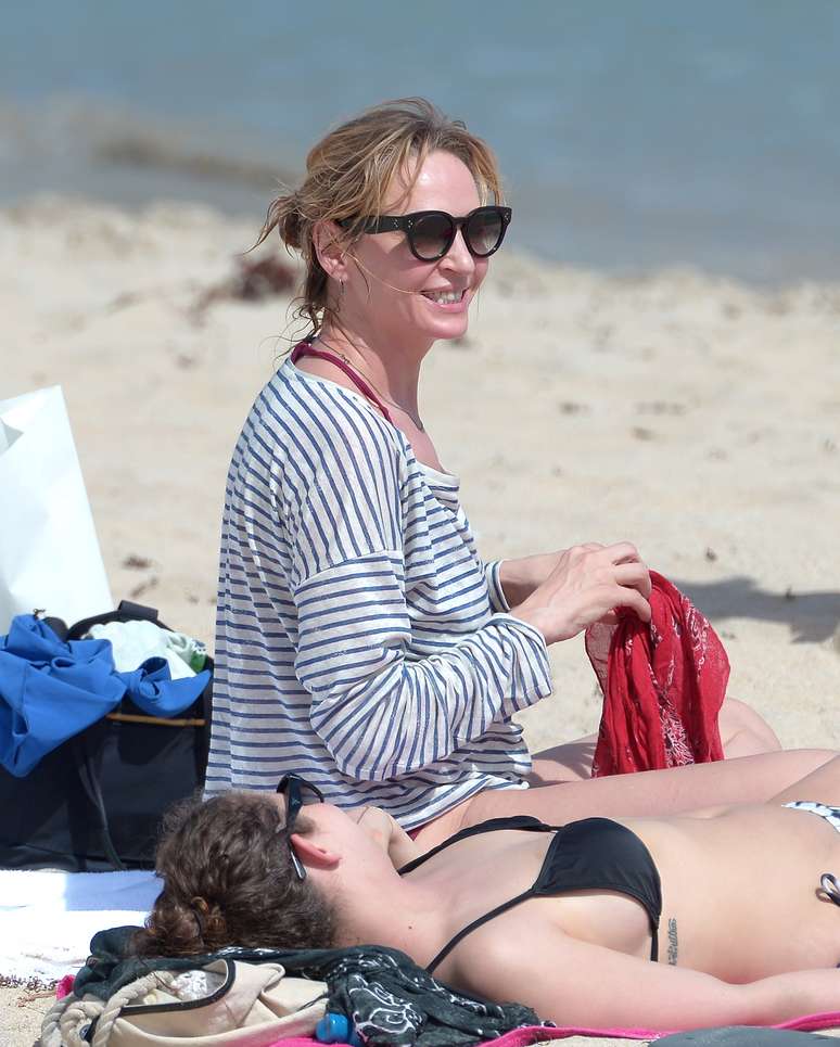 De biquíni, Uma Thurman curte dia de praia e paga cofrinho