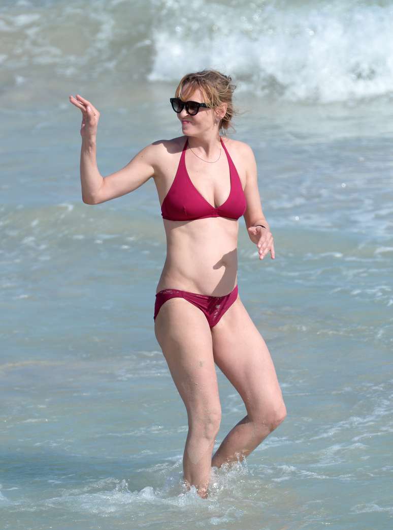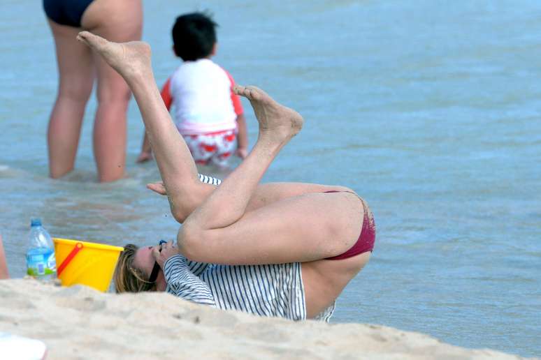 Com biquíni largo na cor vinho, a atriz não se preocupou e brincou com a filha mais nova, entrou no mar, se sujou de areia ao dar cambalhota e chegou até a pagar cofrinho no meio da diversão.