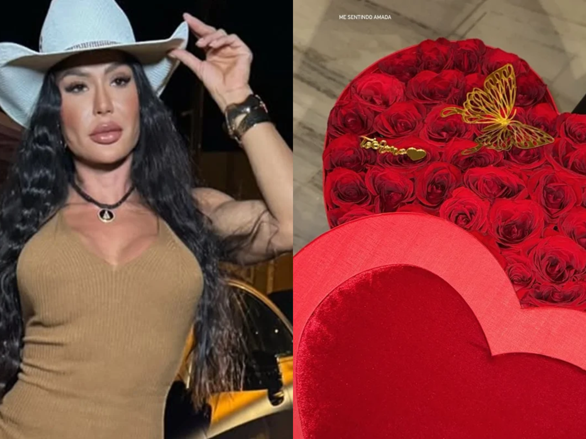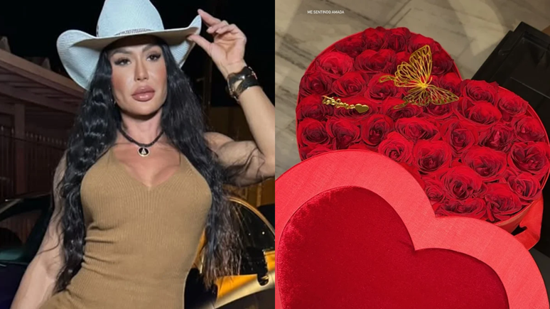 Em meio à rotina de recuperação e ao convívio familiar atípico (com a presença da ex-sogra), um detalhe romântico chamou a atenção: Gracyanne recebeu um enigmático presente. Uma caixa em formato de coração repleta de rosas vermelhas, adornada com uma borboleta dourada.