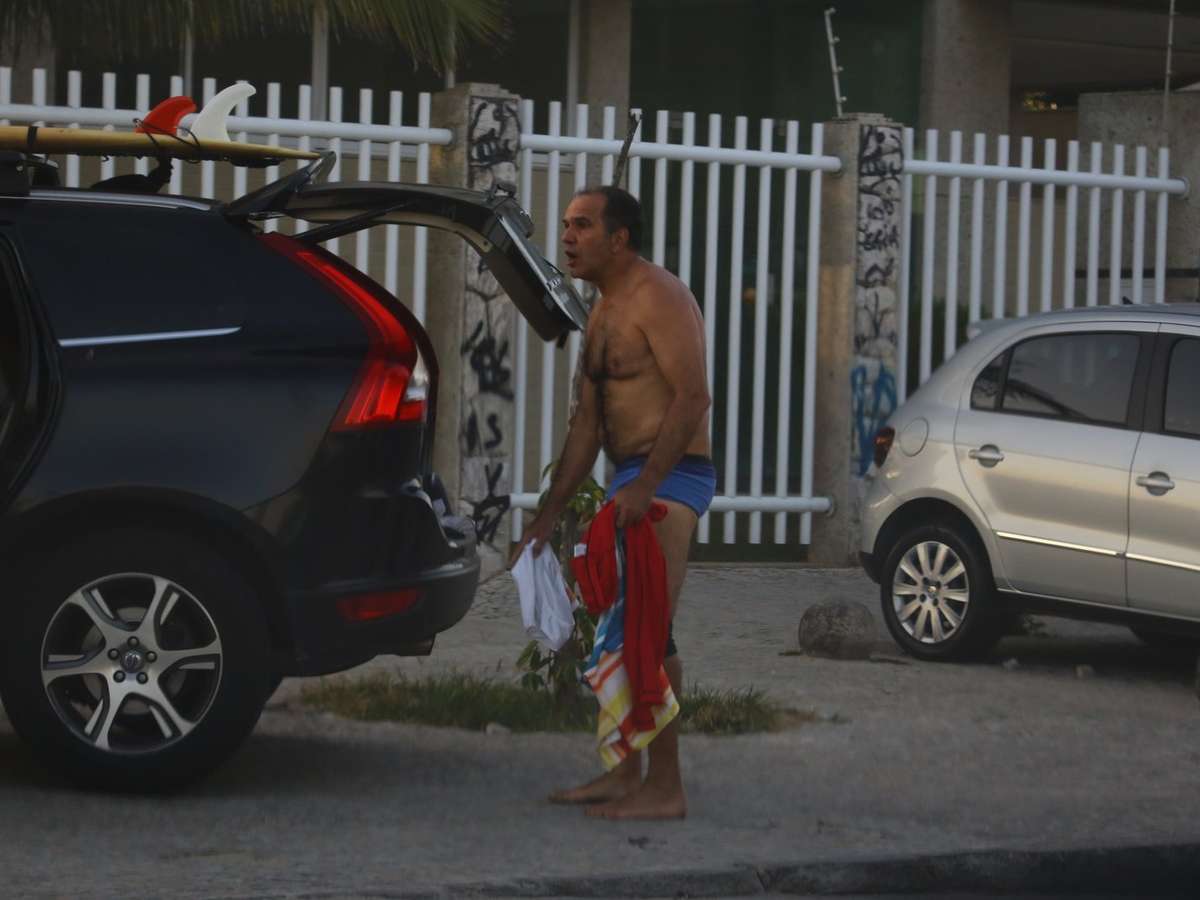 Humberto Martins foi clicado após um dia de surf na praia da Reserva, no Rio de Janeiro, nesta terça-feira (25). Depois de sair do mar, o ator prendeu a prancha em seu carro, tirou a roupa molhada e exibiu uma sunga azul nas proximidades do calçadão