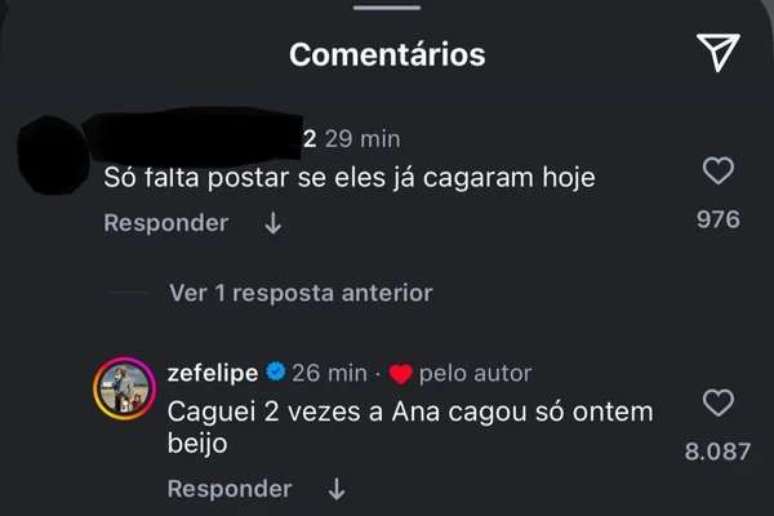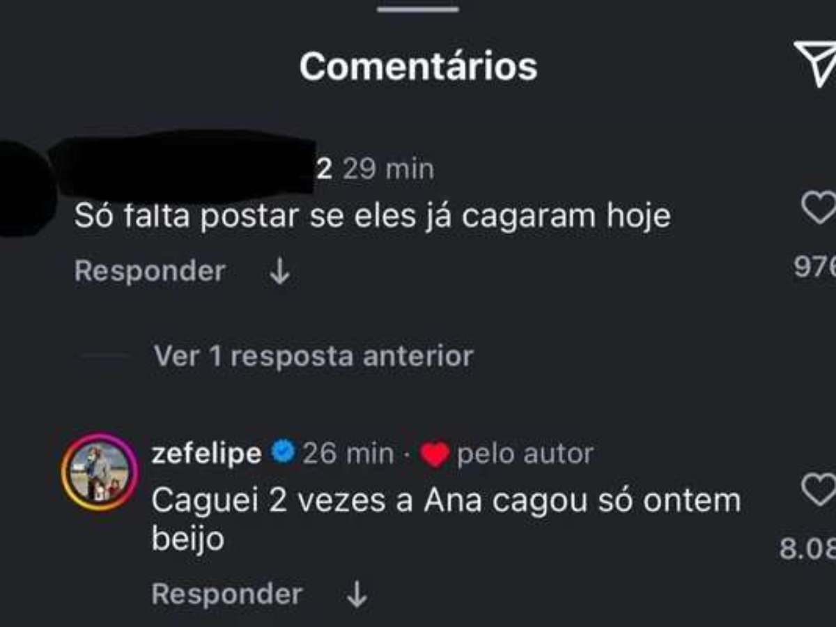 Entre os comentários, uma seguidora reclamou da exposição do casal, dizendo: "Só falta postar se eles já cagaram hoje". O que parecia apenas mais uma crítica aleatória ganhou destaque quando o próprio Zé Felipe decidiu responder. Com seu conhecido jeito direto e bem-humorado, ele rebateu: "Caguei duas vezes, a Ana cagou só ontem. Beijo". A réplica inesperada viralizou na mesma hora, arrancando risadas e dividindo opiniões entre os usuários.