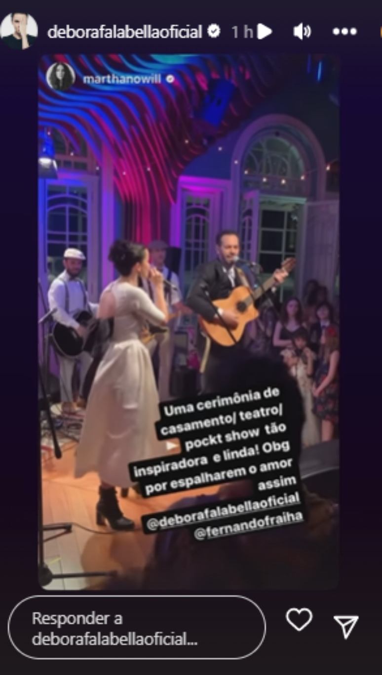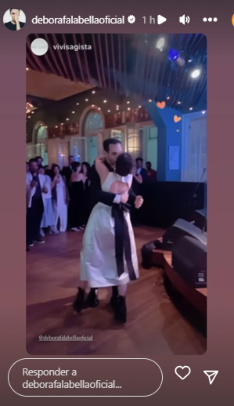 Fotos e vídeos compartilhados nos Stories do Instagram mostraram toda a movimentação dos convidados durante a festa, além de mostrar o casal, que assumiu o relacionamento em dezembro do ano passado, dançando e trocando carinhos. Mas o mais curioso foram os vídeos que mostram Débora cantando acompanhada do noivo ao violão.