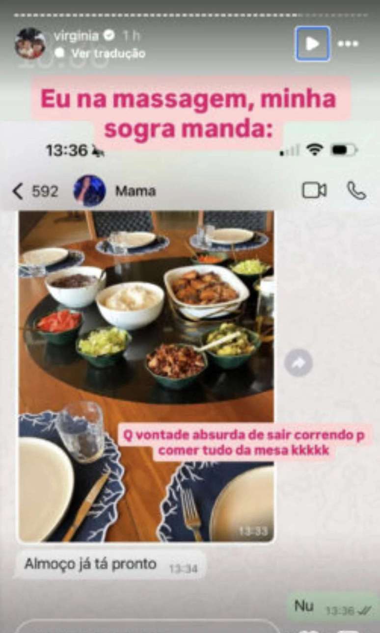 Em meio a uma rotina intensa no Rio de Janeiro, Virginia Fonseca surpreendeu os seguidores ao revelar uma troca de mensagens com a sogra, Fernanda Cristina, nesta quinta-feira (27/11). Enquanto relaxava em uma sessão de massagem, a influenciadora recebeu um aviso inesperado: a mãe de Vini Jr. havia preparado o almoço. Nos stories, Virginia brincou ao comentar: "Eu na massagem, minha sogra manda… Que vontade absurda de sair correndo pra comer tudo da mesa". O detalhe que mais chamou atenção, porém, foi o modo carinhoso como ela salvou o contato da sogra no celular: "Mama".