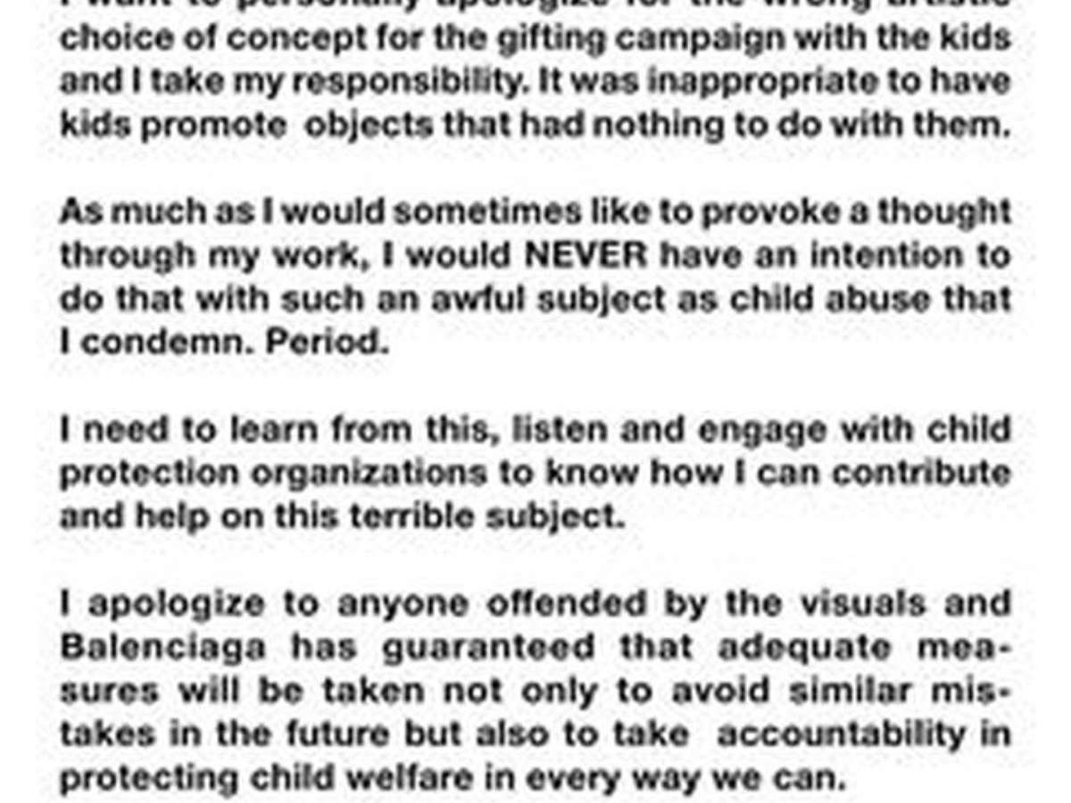 "Condenamos veementemente o abuso infantil; nunca foi nossa intenção incluí-lo em nossa narrativa. As duas campanhas publicitárias em questão refletem uma série de erros graves pelos quais a Balenciaga assume a responsabilidade", disse em nota.
