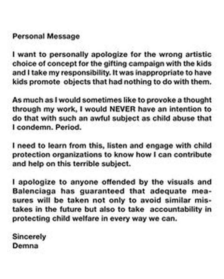 Na última segunda-feira, 28, o CEO da Balenciaga, Cédric Charbitm, também postou um comunicado pedindo desculpas pela campanha.