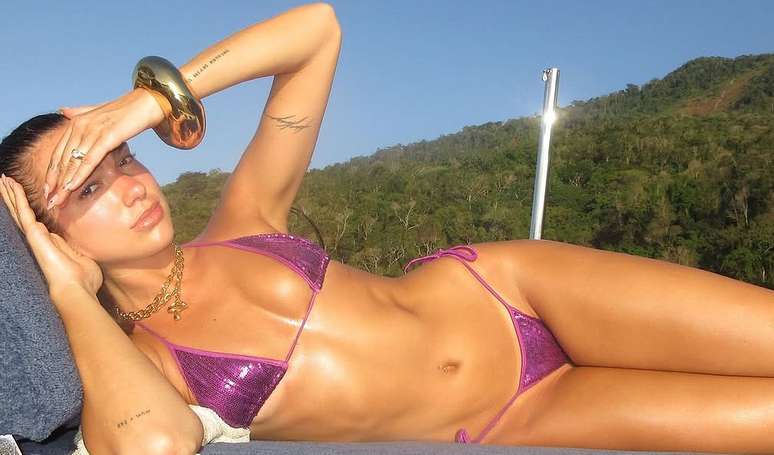 Nas imagens é possível ver Dua Lipa usando biquíni de lacinho - e exibindo um corpo de tirar o fôlego! -, comendo biscoito Globo, um clássico das areias cariocas, e usando chinelos Havaianas, outra marca brasileiríssima. Alguém já deu o CPF pra ela?