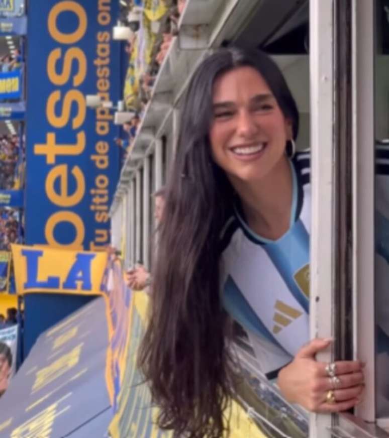 Em outro vídeo, Dua Lipa aparece acenando para os fãs e sorrindo, durante o jogo.