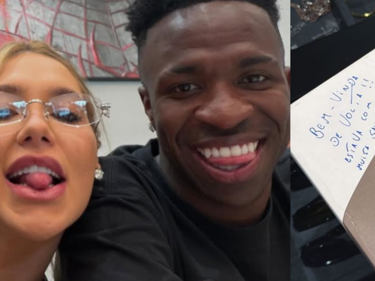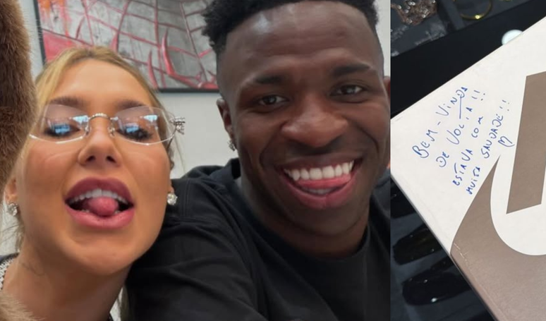 A influenciadora que está de saída do SBT após dois anos na emissora e Vini estavam sem se ver desde janeiro, quando a loira voltou ao Brasil para cumprir a agenda como rainha de bateria da Acadêmicos do Grande Rio. Para garantir um reencontro digno de comédia romântica, o jogador comprou um tênis da Nike para a influenciadora e escreveu um recado manuscrito na própria caixa: "Bem-vinda de volta. Estava com saudade. Te amo".