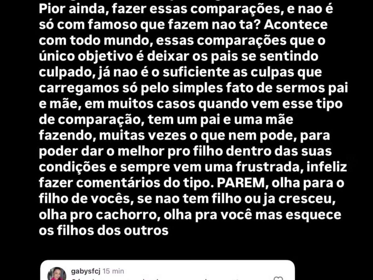 "Já não são suficientes as culpas que carregamos só pelo simples fato de sermos pai e mãe? Em muitos casos, quando vem esse tipo de comparação, tem um pai e uma mãe fazendo muitas vezes o que nem pode para dar o melhor para o filho dentro das suas condições, e sempre vem uma frustrada, infeliz fazer comentários do tipo. Olhem para o filho de vocês! Se não tem filho ou já cresceu, olha para o cachorro, para você, mas esquece os filhos dos outros", encerra o famoso.