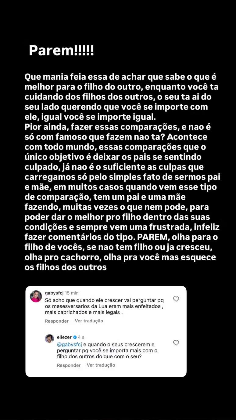 Já nos stories de seu Instagram, Eliezer compartilhou a crítica e voltou a falar sobre o assunto: "Parem! Que mania feia essa de achar que sabe o que é melhor para o filho do outro. Enquanto você tá cuidando dos filhos dos outros, o seu tá aí do seu lado querendo que você se importe com ele, igual você se importe igual".