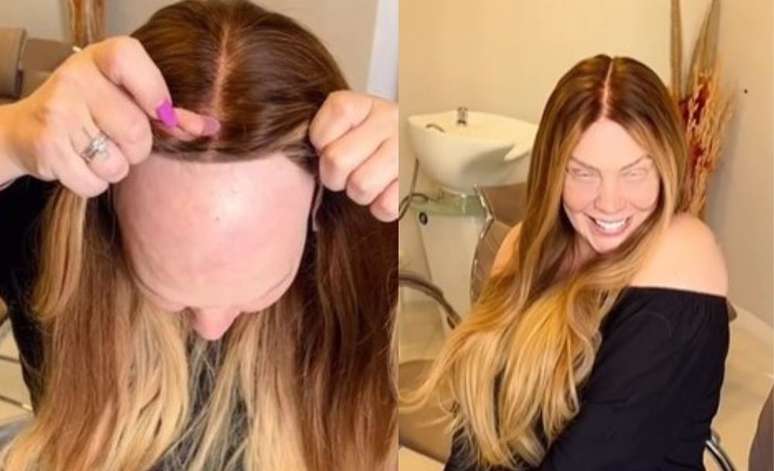 "Gente, vocês lembram que eu saí daqui com a curtinha? Mas eu não consegui me identificar com a curtinha, o meu negócio é a Rapunzel. Ficou perfeito!", declarou Simony, que em seguida mostrou a careca. "Olha, não tem cabelo nenhum, meninas. Aí a gente faz assim", disse, enquanto mostrava como se coloca a peruca.