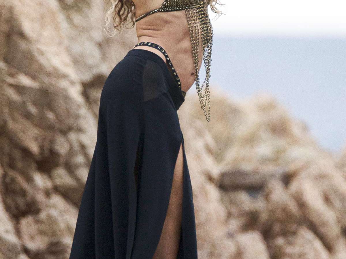 Para o trabalho, a colombiana usou um biquíni feito de correntes e uma saia longa preta, com generosa fenda lateral.