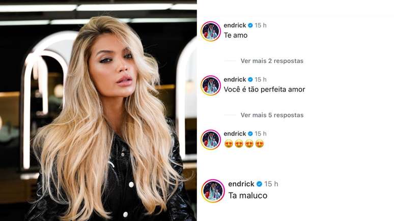 Gabriely postou a foto com a legenda: "A felicidade é loira". Nos comentários, Endrick, que joga pelo Lyon, da França, fez uma série de comentários apaixonado. "Te amo. Você é tão perfeita, amor. Tá maluco".
