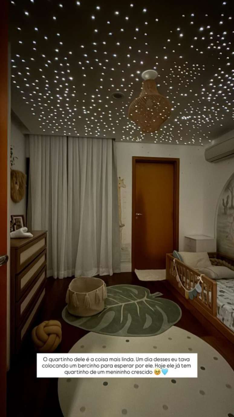"O quartinho dele é a coisa mais linda. Um dia desses eu tava colocando um berço pra esperar por ele, e hoje já tem quartinho de um menininho crescido", disse a mamãe ao relembrar a evolução do espaço desde a chegada do herdeiro mais velho.