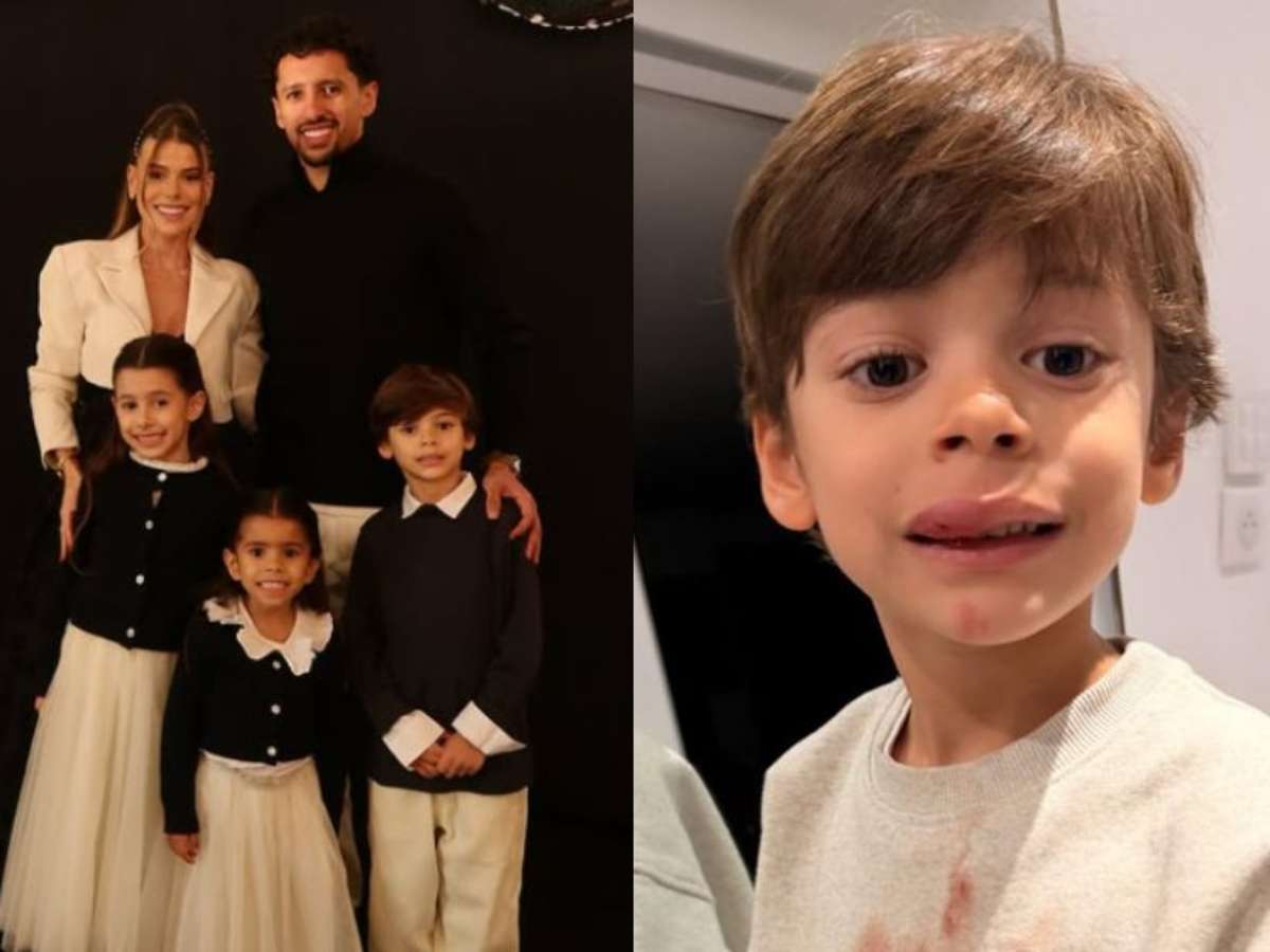 Filho de Marquinhos, do PSG, sofreu um acidente doméstico, cortou a boca e levou pontos; Carol Cabrino relatou o susto e ressaltou que o dente permanente não foi afetado.