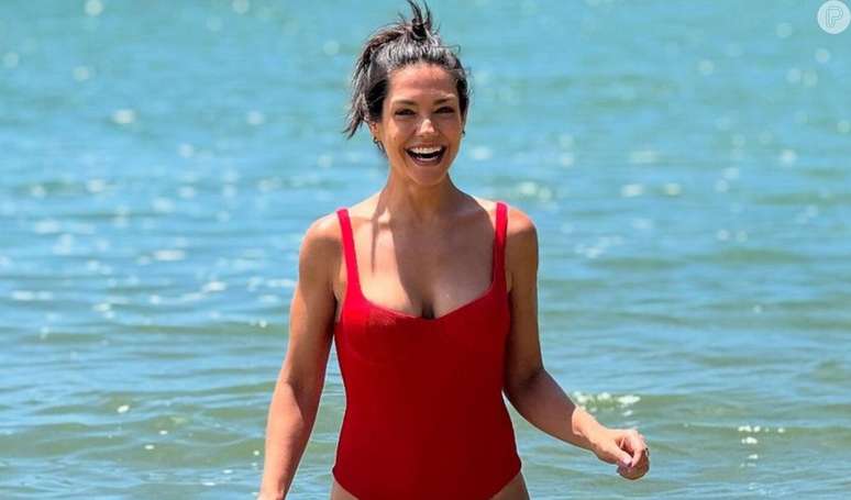 Esposa de Michel Teló, Thais Fersoza valoriza corpo em maiô vermelho na praia e recebe elogios: 'Linda sem ser vulgar'