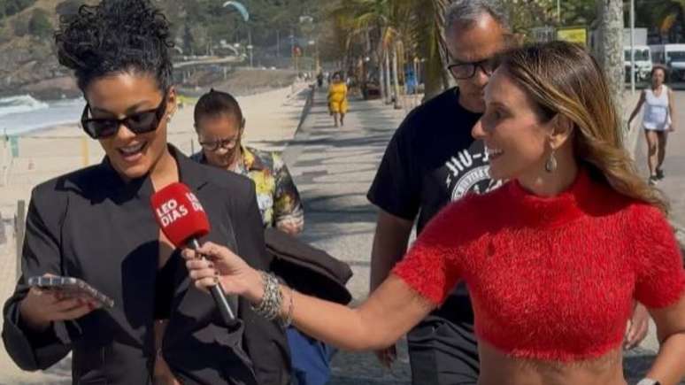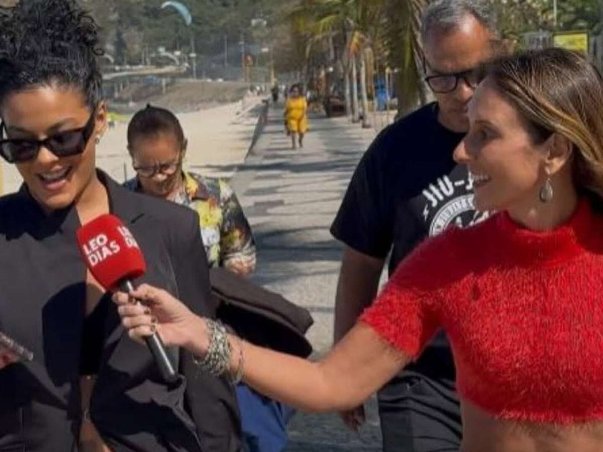 Durante intervalo do trabalho, a jornalista elogiou a artista pela sua atuação na trama. Enquanto isso, Bella andava olhando para o celular e apenas agradeceu. Monique pediu um resumo da novela para a atriz, no entanto, ela disparou: "Eu tô atrasada pra gravar", falou, saindo rapidamente.