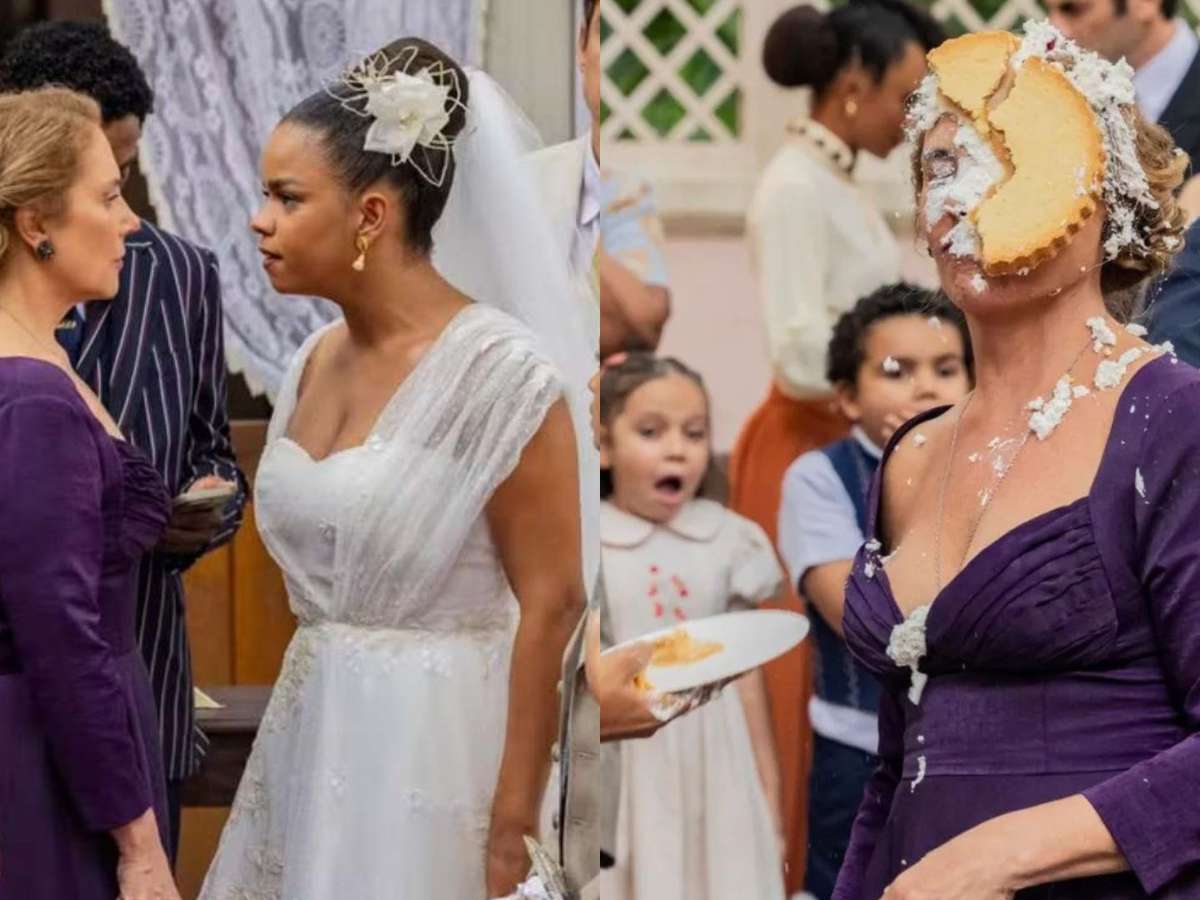 Tudo correria em paz se não fosse a intervenção de Zulma no momento de colocar as alianças. "Faltou perguntar se alguém é contra essa união", dispara a vilã. Dita reage com surpresa: "Ah não, num acridito!". O noivo também não esconde seu espanto: "O qui qui ocê tá fazeno aqui, Zuma?". A provocadora, então, inicia a confusão atirando um pedaço de bolo na rival. "Sua desquitada interesseira! E aí, como vai casar agora toda lambuzada de bolo?", provoca Zulma.