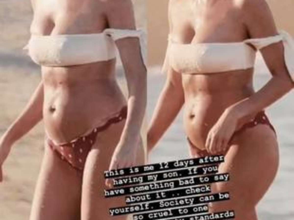 "Essa sou eu doze dias após ter o meu filho. Se você tem alguma coisa má para dizer sobre isso… olhe para você mesmo. A sociedade pode ser cruel com as pessoas. Padrões de beleza são impossíveis para as mulheres hoje em dia. Eu não estou envergonhada de mostrar minha barriga pós-parto. Eu estou orgulhosa, na verdade. Eu carreguei meu filho por nove meses nela, eu acho que tenho o direito de ficar com uma barriguinha! É por que eu sou modelo? Bem, nós somos pessoas normais também, então me deixem curtir a praia em paz", escreveu a modelo.