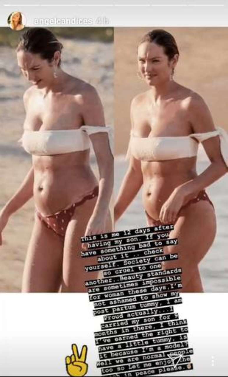 A modelo sul-africana Candice Swanepoel fez post no Stories do seu Instagram comentando fotos suas que foram tiradas por paparazzi enquanto passava férias em Vitória, no Espírito Santo. Duas semanas após dar à luz seu segundo filho, Ariel, do relacionamento com o modelo brasileiro Hermann Nicoli, respondeu às críticas que recebeu por usar um biquíni tão pouco tempo após o parto e disse que não tem nada do que se envergonhar.