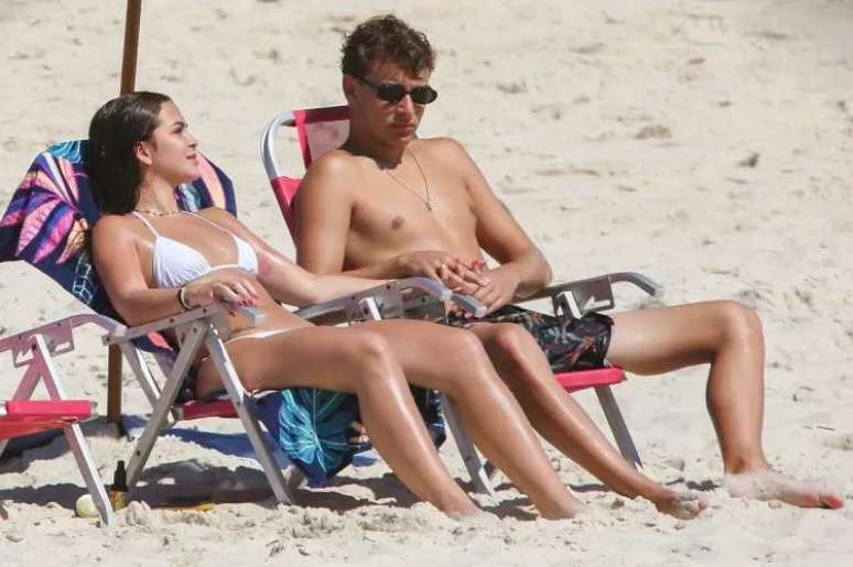 O casal ficou juntinho enquanto renovaram o bronzeado na areia e ainda trocaram um beijo cheio de amor e carinho antes de ir embora.