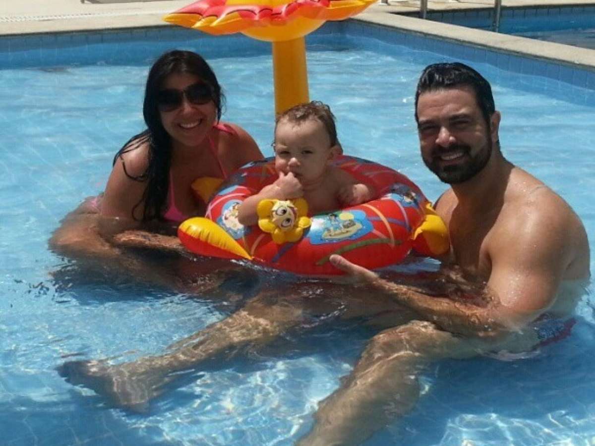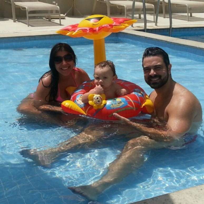 A ex-participante do Big Brother Brasil Priscila Pires aproveitou o calor deste sábado (16) para curtir uma piscina ao lado do filho Gabriel, 9 meses, e do marido, Bruno Andrade