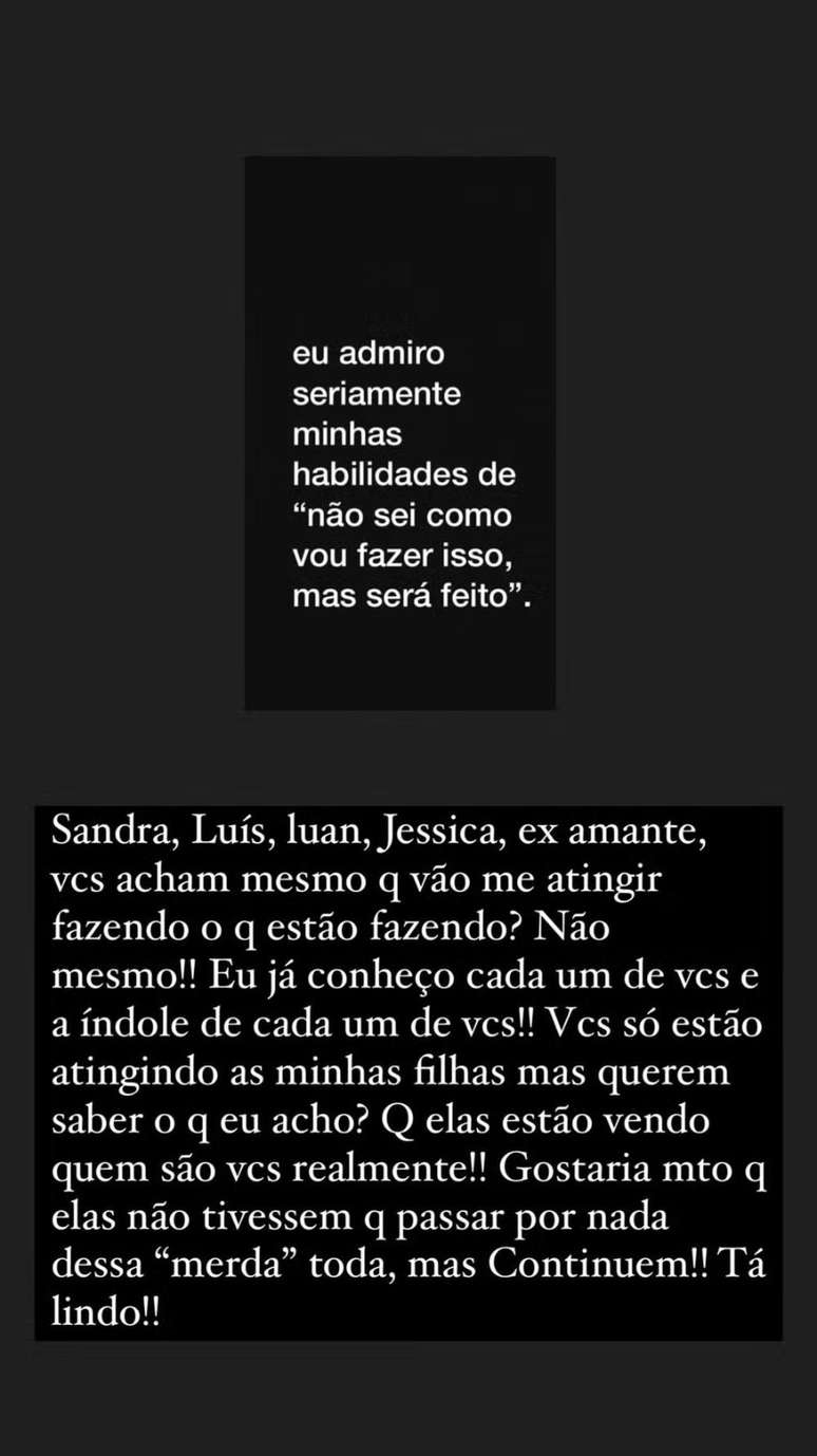 "Sandra, Luís, Luan, Jessica, ex-amante, vocês acham mesmo que vão me atingir fazendo o que estão fazendo? Não mesmo! Eu já conheço cada um de vocês e a índole de cada um. Vocês só estão atingindo as minhas filhas, mas querem saber o que eu acho? Que elas estão vendo quem são vocês realmente. Gostaria muito que elas não tivessem que passar por nada dessa 'merda' toda, mas continuem. Está lindo!", escreveu em um desabafo nos Stories do Instagram.