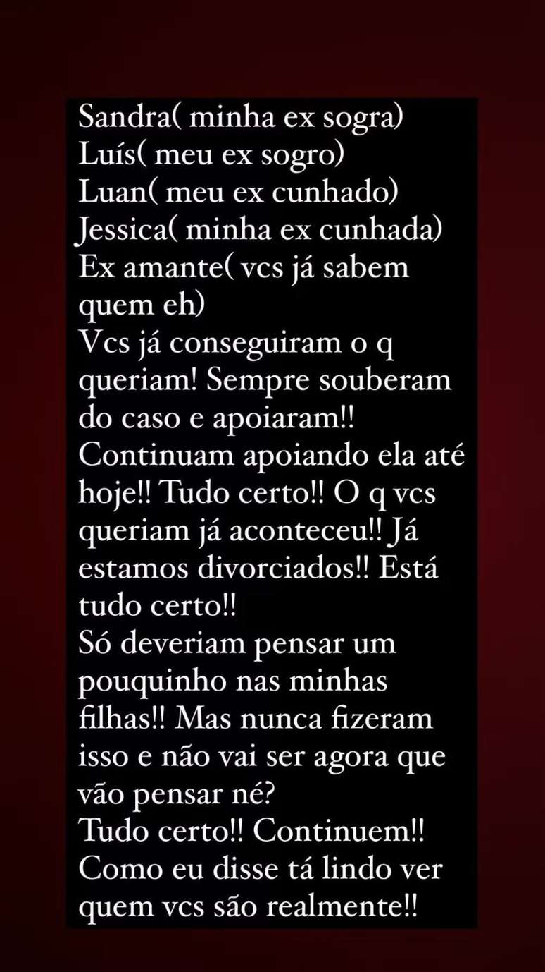 "Sandra (minha ex-sogra), Luís (meu ex-sogro), Luan (meu ex-cunhado), Jessica (minha ex-cunhada), Ex-amante (vocês já sabem quem é)", escreveu.