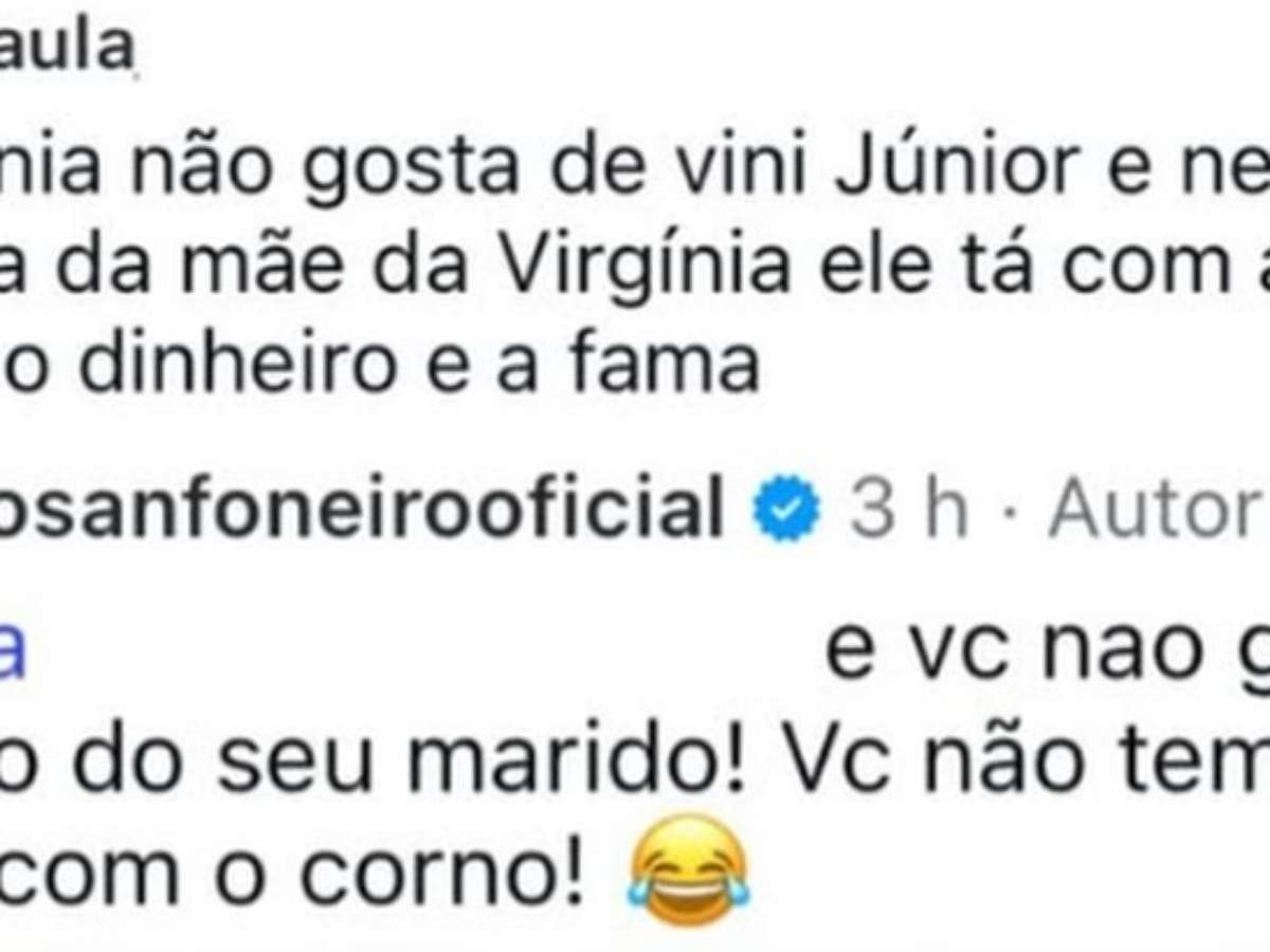 "Virgínia não gosta de Vini Jr. e nem Danilo gosta da mãe da Virgínia, ele está com a Margareth pelo dinheiro e a fama", dizia o comentário. A provocação gerou uma reação imediata. Sem tentar amenizar o conflito, Danilo Nascimento respondeu de forma agressiva: "E você não gosta do corno do seu marido! Você não tem nenhuma foto com o corno!". A troca de mensagens dividiu opiniões, com parte do público criticando o ataque pessoal e outros defendendo o direito do músico de reagir às acusações.