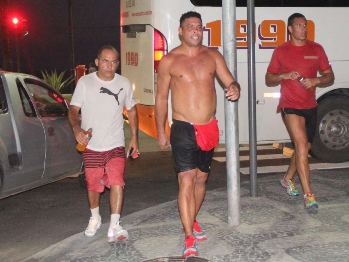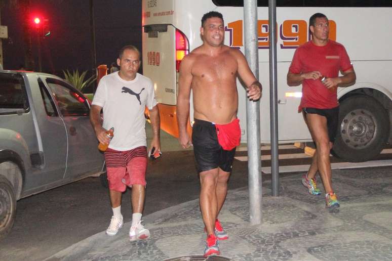 O ex-jogador Ronaldo contou com dois seguranças para correr no Leblon, no Rio de Janeiro, nesta quarta-feira (6). Com tênis, bermuda e sem camiseta, ele se exercitou na orla da praia e chamou a atenção de um grupo de jovens que estava no local