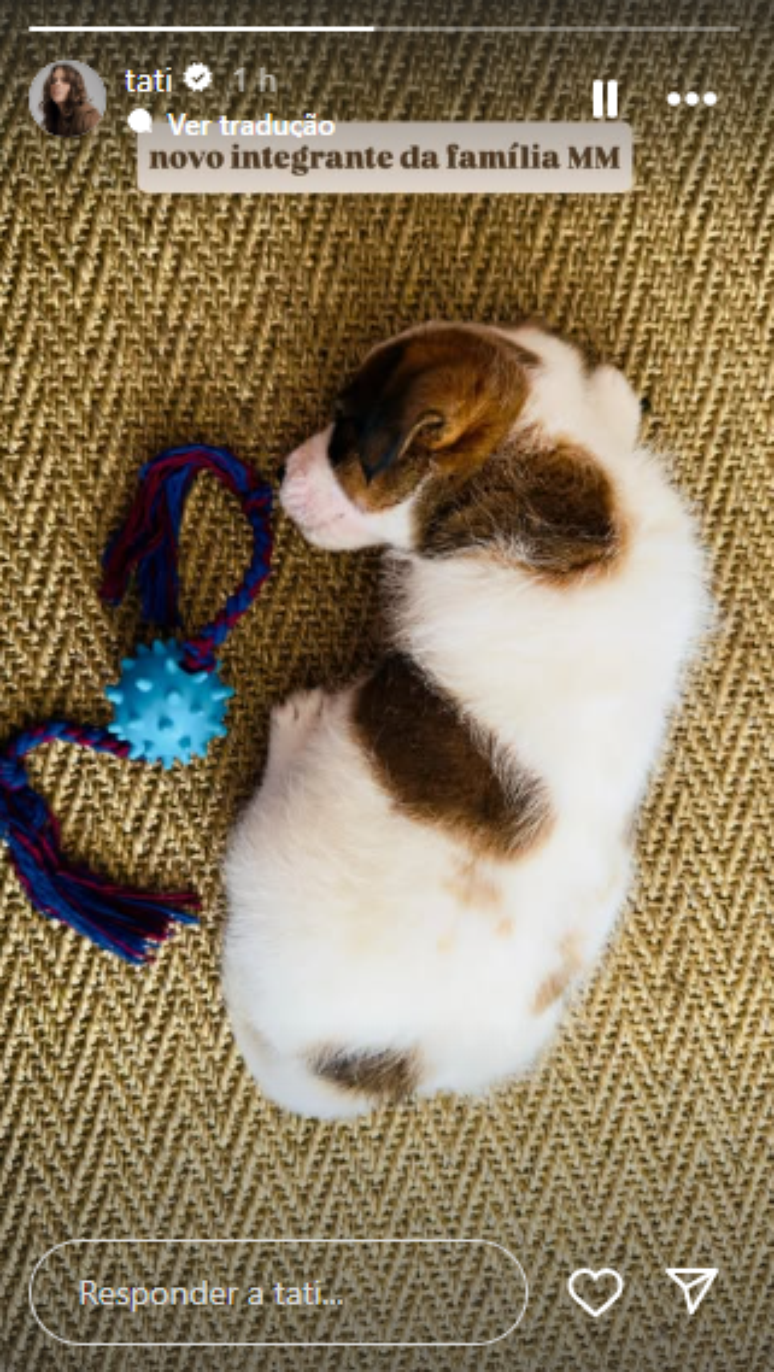 Na foto, do cãozinho deitado ao lado de um brinquedo quase maior que ele, Tati escreveu: "Novo integrante da família MM". O uso das siglas MM se refere aos sobrenomes de Tati (Machado) e seu marido (Monteiro).