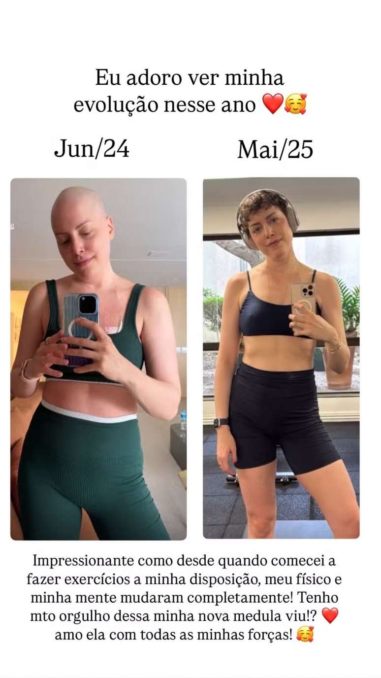 Fabiana Justus, de 38 anos, publicou nesta segunda-feira, 26, um comparativo de sua transformação corporal. "Adoro ver minha evolução nesse ano", afirmou a influenciadora ao compartilhar uma imagem de junho do ano passado e outra registrada em maio deste ano. Nas duas fotos, a filha de Roberto Justus aparece usando roupas de academia. Com um visual mais enxuto e definido, Fabi contou estar satisfeita com seu avanço.
