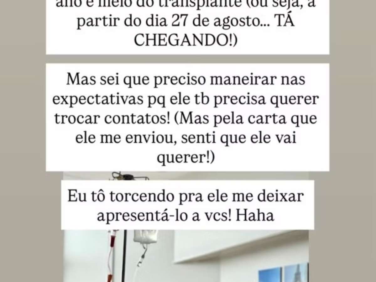 Logo em seguida, ela disse: "Ainda tô processando tudo, mas senti no coração que precisava dividir esse momento com vocês. Tô muito emocionada e feliz!". A influenciadora também contou que o doador tem 25 anos e mora nos Estados Unidos.
