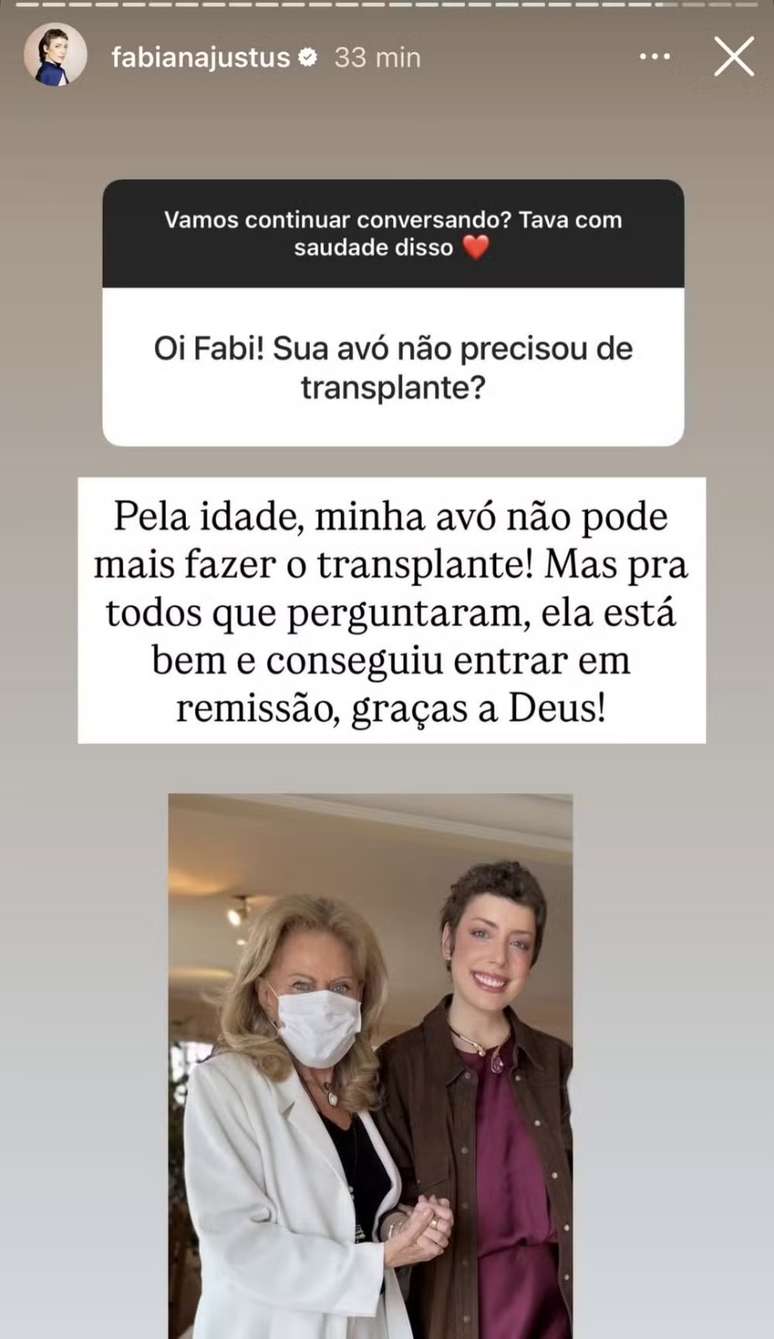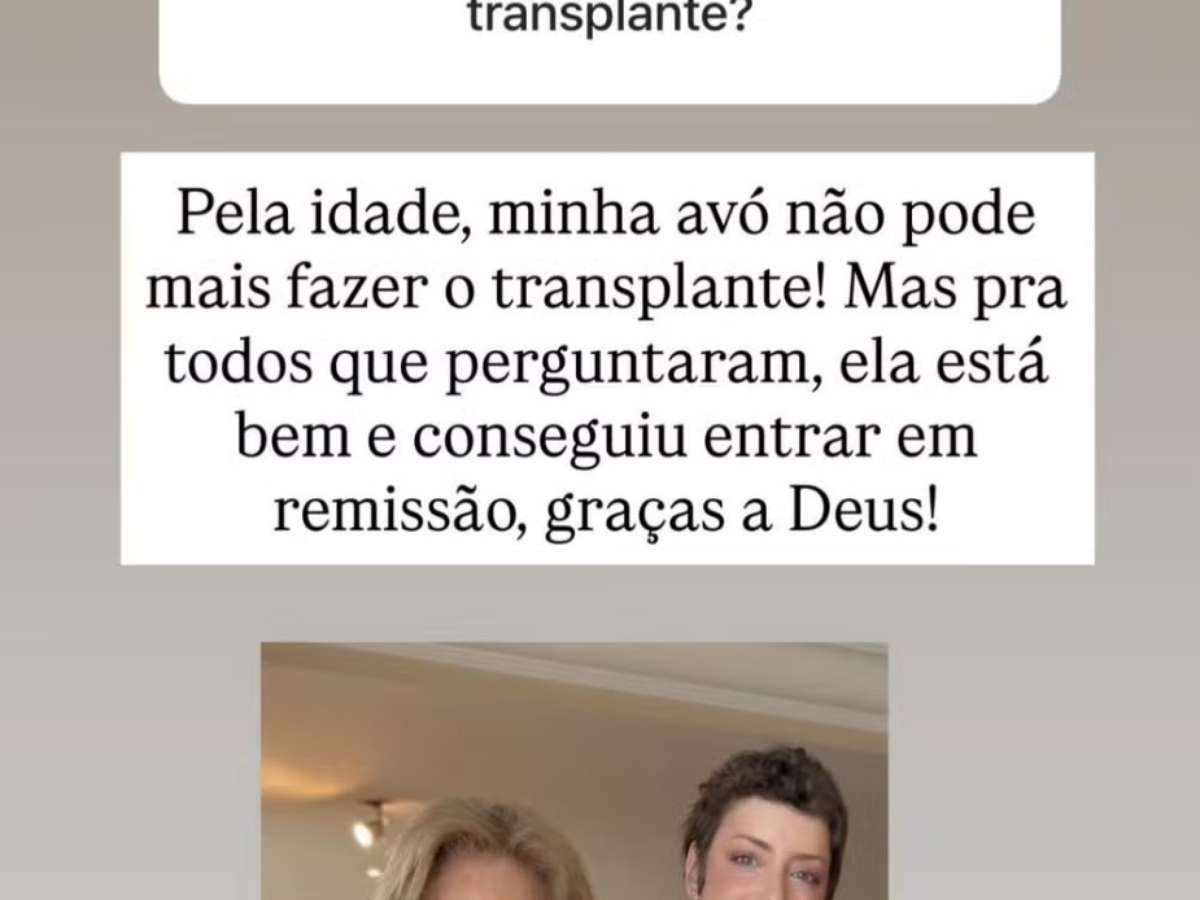"Pela idade, minha avó não pode mais fazer o transplante. Mas para todos que perguntaram, ela está bem e conseguiu entrar em remissão, graças a Deus", disse Fabiana.