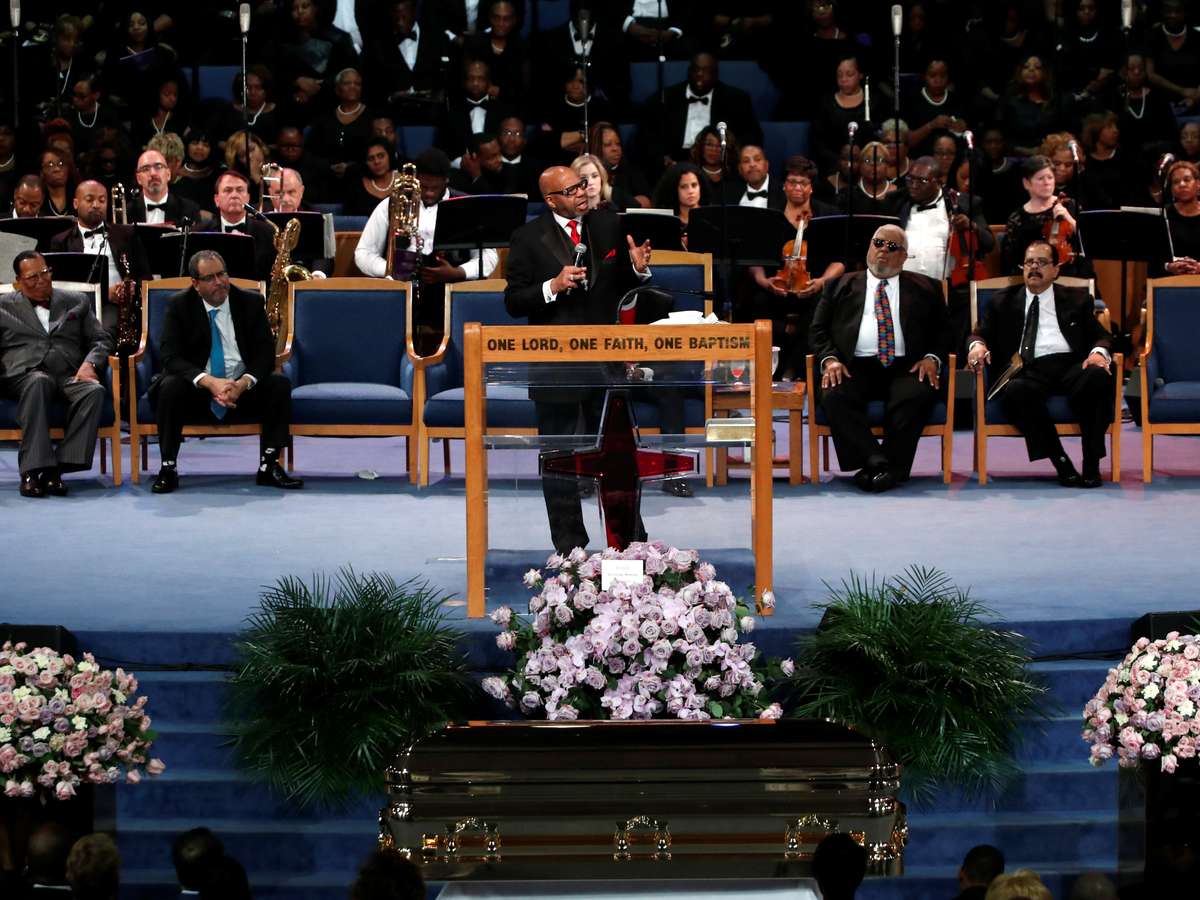 Vestido com um terno preto, uma gravata vermelha brilhante, o pastor baseado em Atlanta começou a louvar a Deusa do soul com uma rendição apaixonada do hino popular, "Pai, estendo minhas mãos a ti". Uma grande cruz de prata balançava em seu pescoço.