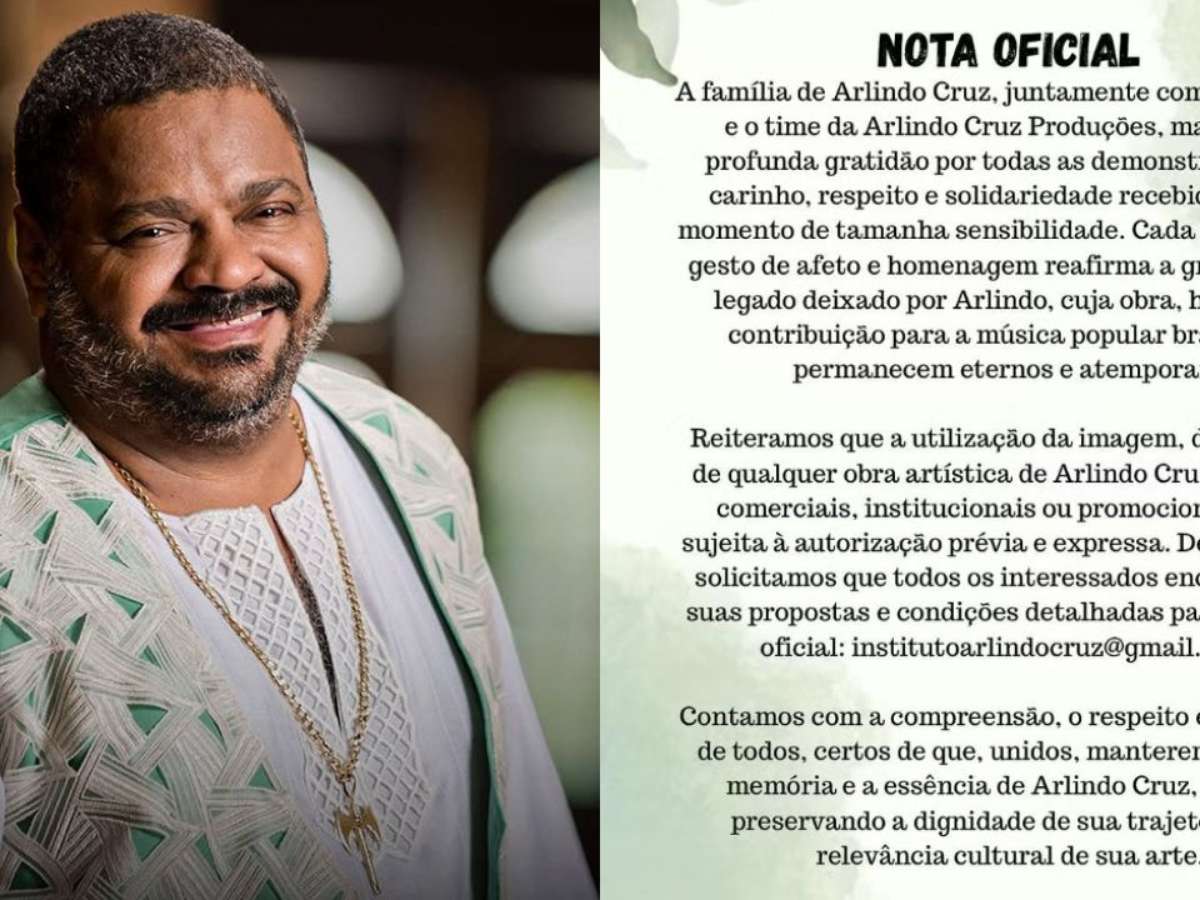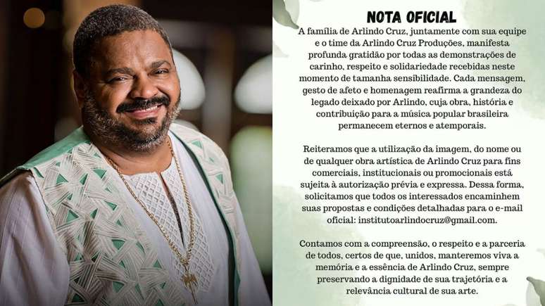 "Reiteramos que a utilização da imagem, do nome ou de qualquer obra artística de Arlindo Cruz para fins comerciais, institucionais ou promocionais está sujeita a autorização prévia e expressa. Dessa forma, solicitamos que todos os interessados encaminhem suas propostas e condições detalhadas para o e-mail oficial", afirma o comunicado.