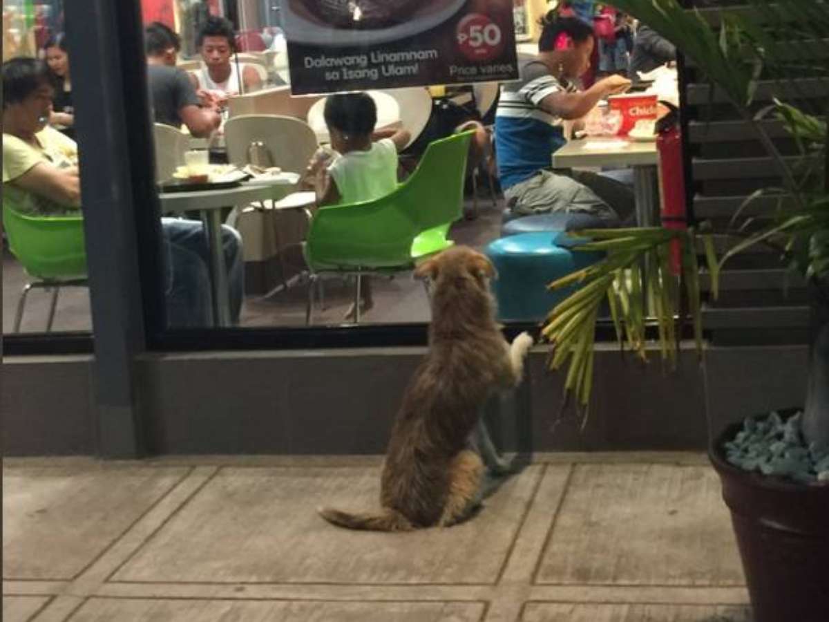 O cachorro ficava parado no vidro de um restaurante das Filipinas, quando algumas pessoas resolveram lhe dar comida