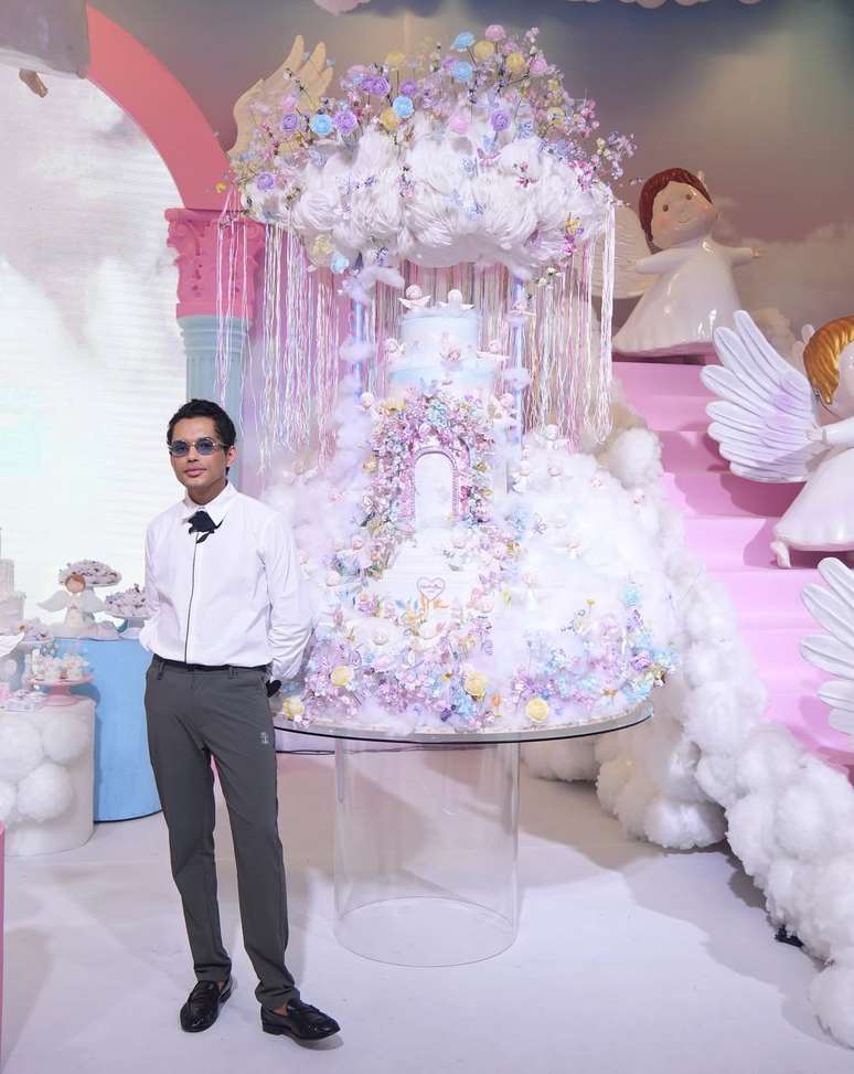 Com nuvens espalhadas pelo salão e bonecos de anjos decorando os espaços, a decoração se destacou pelos balões em diferentes tamanhos e nos tons delicados de azul, rosa e branco, criando uma atmosfera mágica que remetia ao céu.