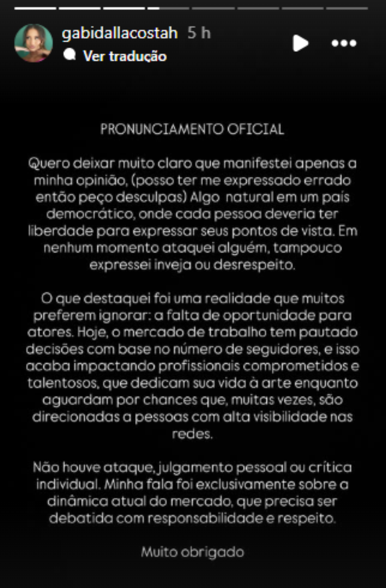“O que destaquei foi uma realidade que muitos preferem ignorar: a falta de oportunidade para atores. Hoje, o mercado de trabalho tem pautado decisões com base no número de seguidores, e isso acaba impactando profissionais comprometidos e talentosos, que dedicam suas vidas à arte, enquanto aguardam por chances que, muitas vezes, são direcionadas a pessoas com alta visibilidade nas redes. [...] Minha fala foi exclusivamente sobre a dinâmica atual do mercado, que precisa ser debatida com responsabilidade e respeito”, disse a atriz.