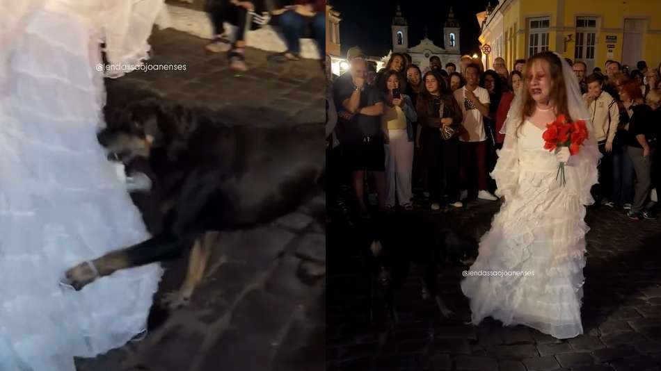 Cachorro invade ‘cena mais triste’ de encenação e leva público aos risos em MG. O caso foi registrado durante a apresentação do grupo teatral Lendas São Joanenses, de São João del Rei, na quinta-feira, 23. “Era pra ser a cena mais triste da lenda… até esse cachorro aparecer”, disse o perfil ao divulgar a imagem da atriz tentando prosseguir na cena. A ação do animal puxando o vestido da noiva, interpretada pela atriz Monique Silva, fez os espectadores rirem da situação.  Reprodução/lendassaojoanenses/Instagram
