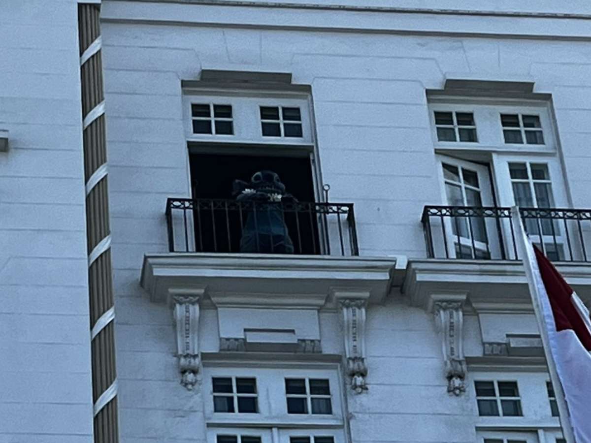 Fãs da cantora Lady Gaga foram surpreendidos na manhã desta quarta-feira, 30, com a aparição do personagem animado Stitch e da socialite Narcisa Tamborindeguy nas varandas do icônico Copacabana Palace Hotel.