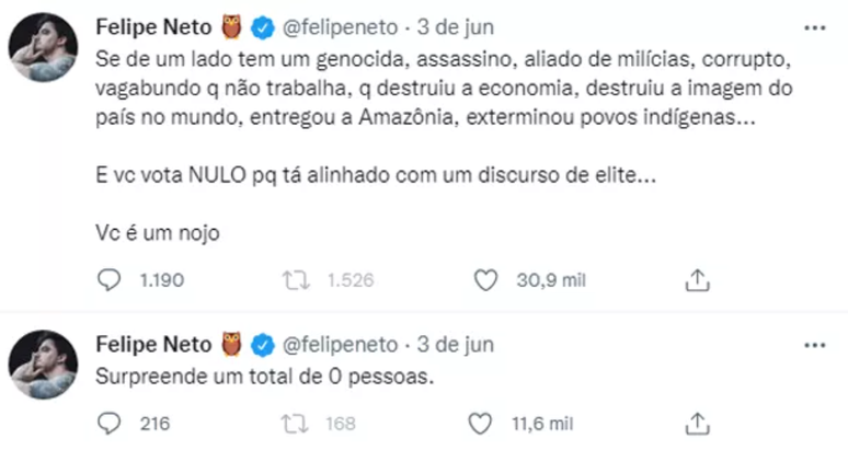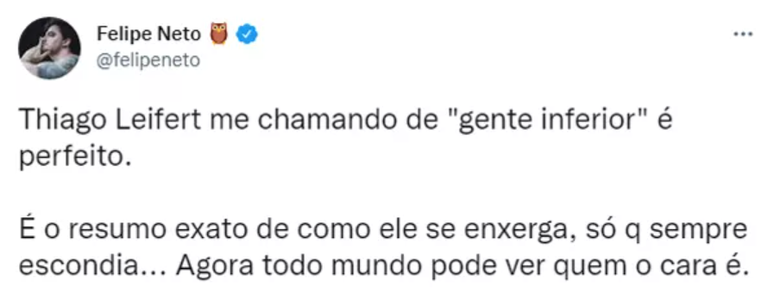 Na ocasião, Felipe Neto criticou uma fala de Leifert sobre votar nulo nas eleições presidenciais de 2022. Na época, o influencer chamou o ex-apresentador do BBB de "nojo".