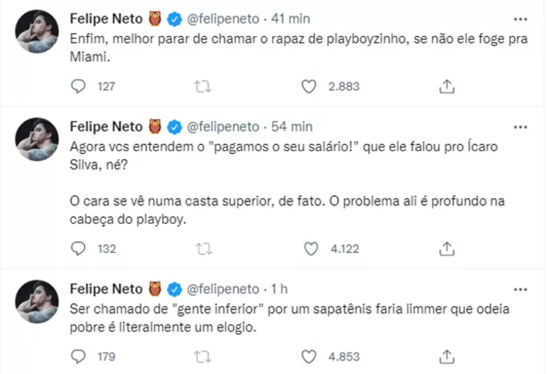 "Agora vocês entendem o 'pagamos o seu salário!' que ele falou para o Ícaro Silva, né? O cara se vê em uma casta superior, de fato. O problema ali é profundo na cabeça do playboy", acrescentou.