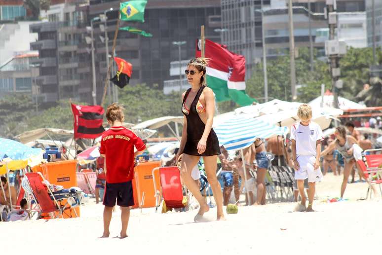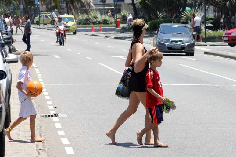 Fernanda Lima brinca com seus gêmeos no Leblon