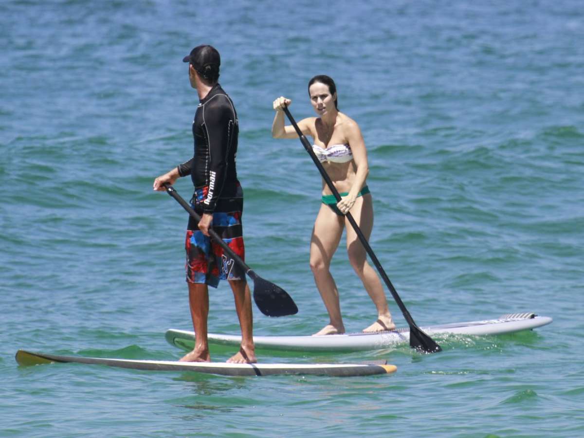 A atriz Fernanda Pontes aproveitou o dia de calor e sol no Rio de Janeiro para praticar stand up paddle nesta quinta-feira (21), na praia da Barra da Tijuca. Ela foi auxiliada por um instrutor.