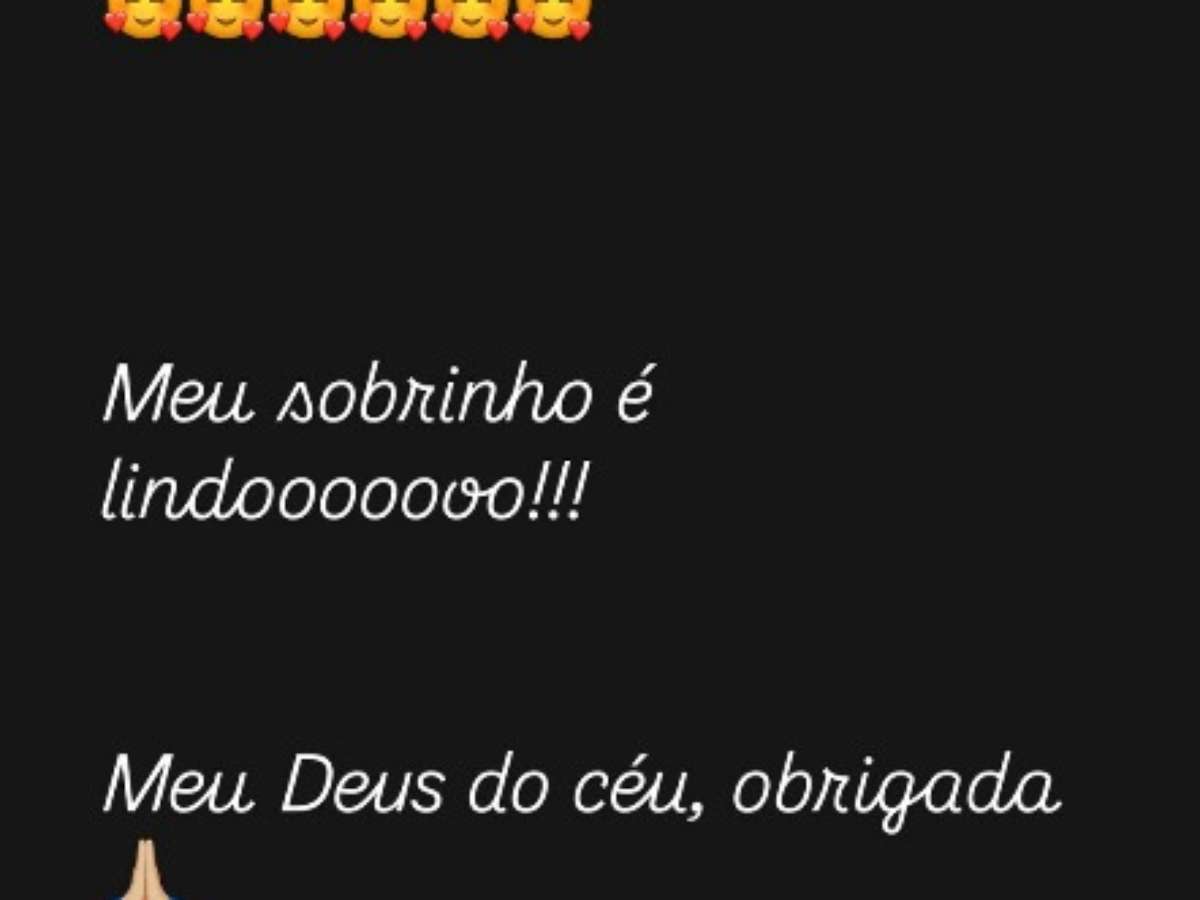 Nos stories, ela mostrou um enfeite da maternidade com o nome do recém-nascido. Em seguida, celebrou a beleza do sobrinho. "Gente, eu estou apaixonada. Meu sobrinho é lindo! Meu Deus do céu, obrigada", vibrou. O pai também anunciou a chegada do herdeiro com uma foto de sua mão e a legenda "Mãozinha do pai todinha".