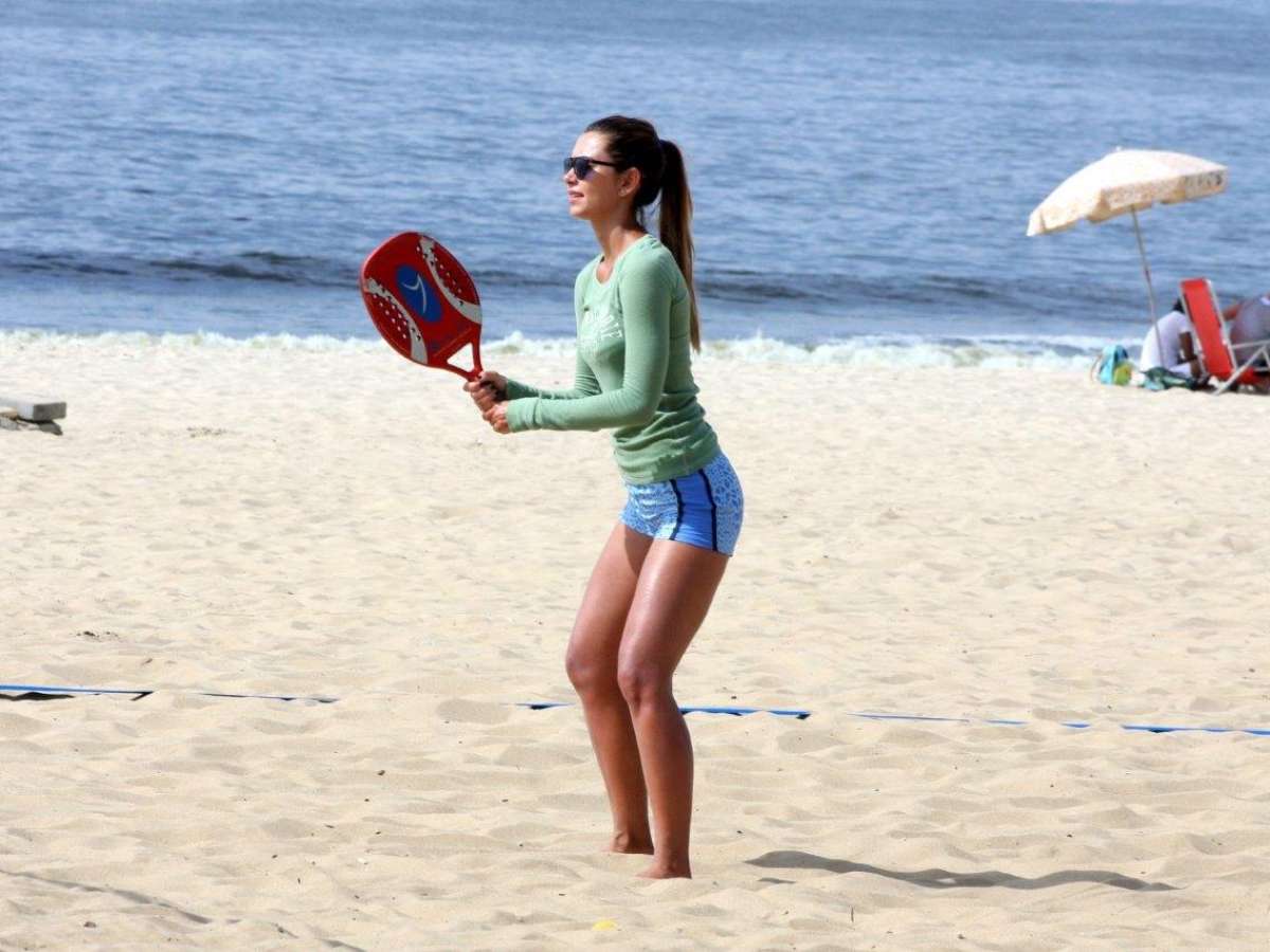 Leticia Wiermann, filha do apresentador José Luiz Datena, aproveitou esta segunda-feira (16) ensolarada para relaxar na praia de Ipanema, zona sul do Rio de Janeiro. Depois de ser clicada caminhando na orla com o namorado, Bernardo, ela trocou carinhos com o amado e também jogou tênis de areia.