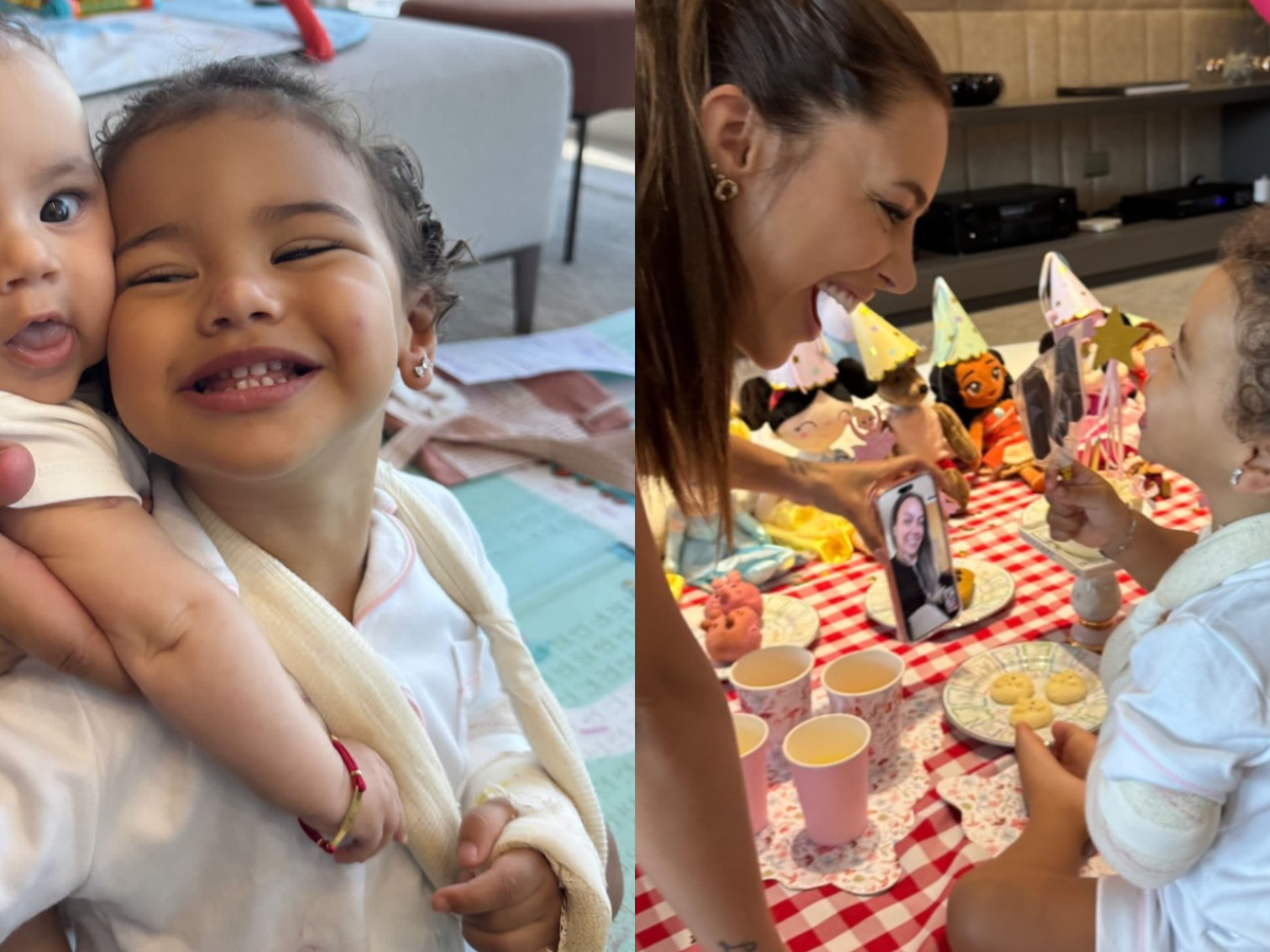 A influenciadora também mostrou momentos fofos de Mavie ao lado da irmã mais nova, Mel, de 3 meses. Nas fotos, a aniversariante está com o braço engessado, pois se machucou no dia anterior.